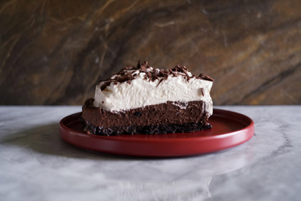 Spread or pipe the whipped cream over the chilled pie and garnish with chocolate shavings. Let the pie sit at room temperature for about 15-20 minutes before slicing to soften slightly for the best flavor and texture.