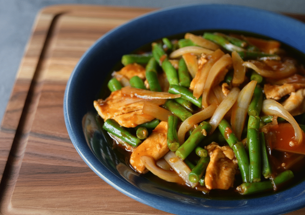 • Add the green beans and stir-fry for 2-3 minutes until bright green with some charred spots.