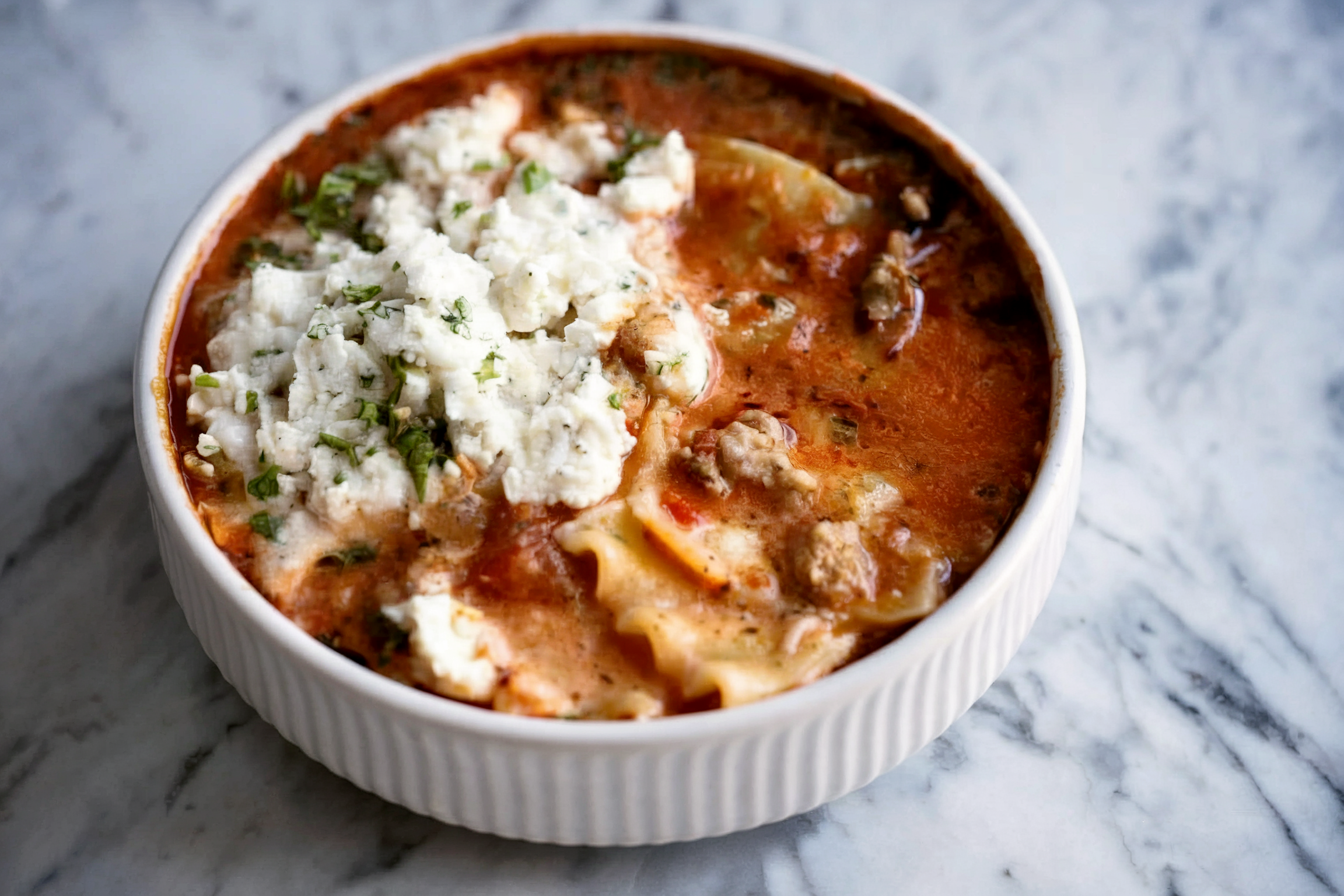 While the soup simmers, combine the ricotta, mozzarella, Parmesan, fresh parsley, and black pepper in a bowl for the topping.