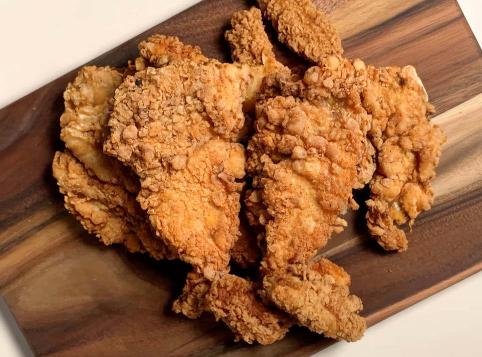 Let the coated tenders rest on the wire rack for ~15-20 minutes. This helps the coating dry out and adhere to the chicken, so it won’t fall off in the fryer.