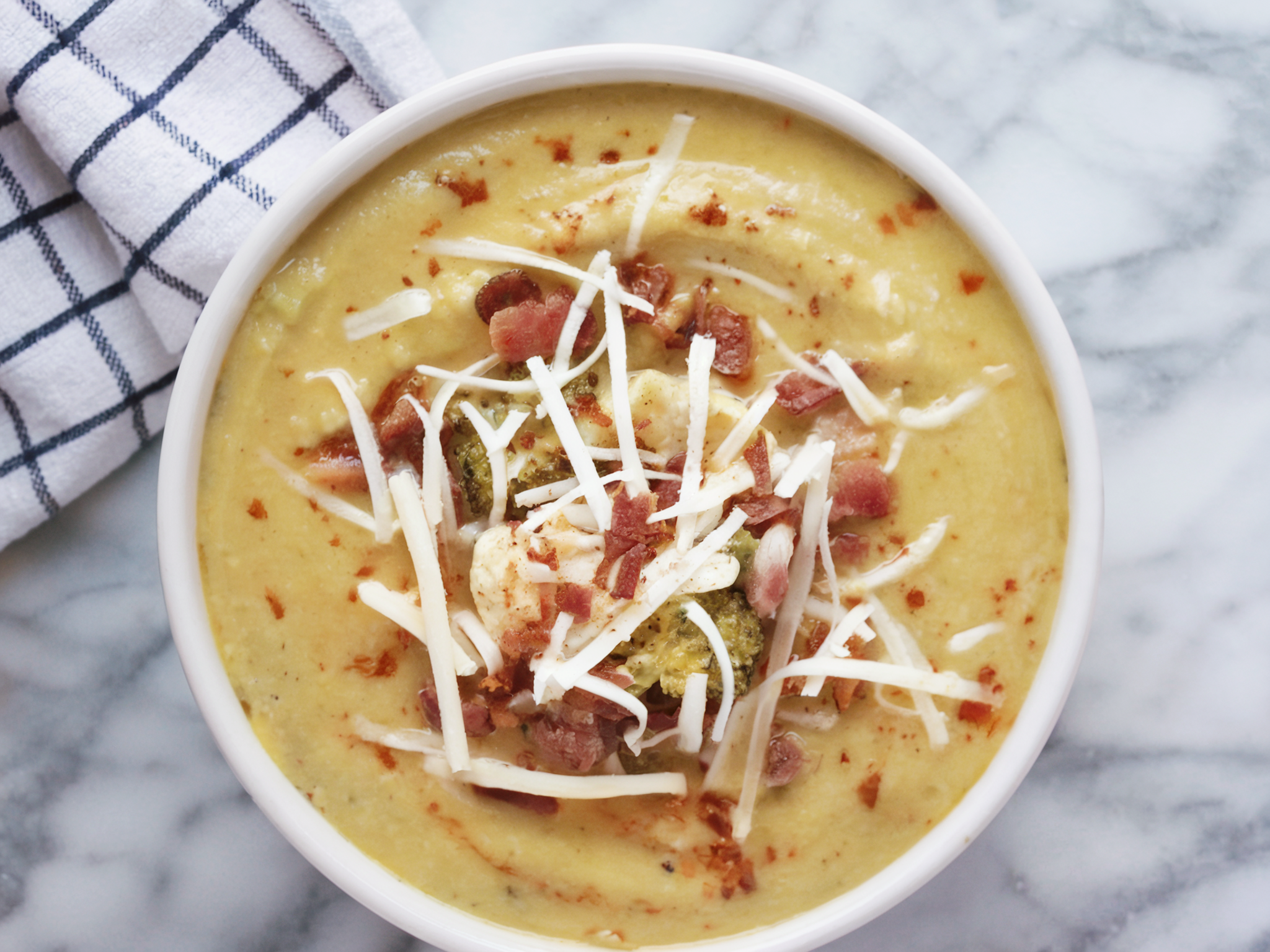 Stir in the reserved roasted florets and half of the crispy bacon. Season with salt and pepper to taste. Serve the soup hot, garnished with the remaining bacon bits.